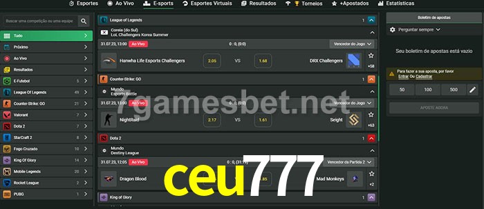 O ceu777 oferece uma grande seleção de opções de apostas em e-sports com probabilidades competitivas